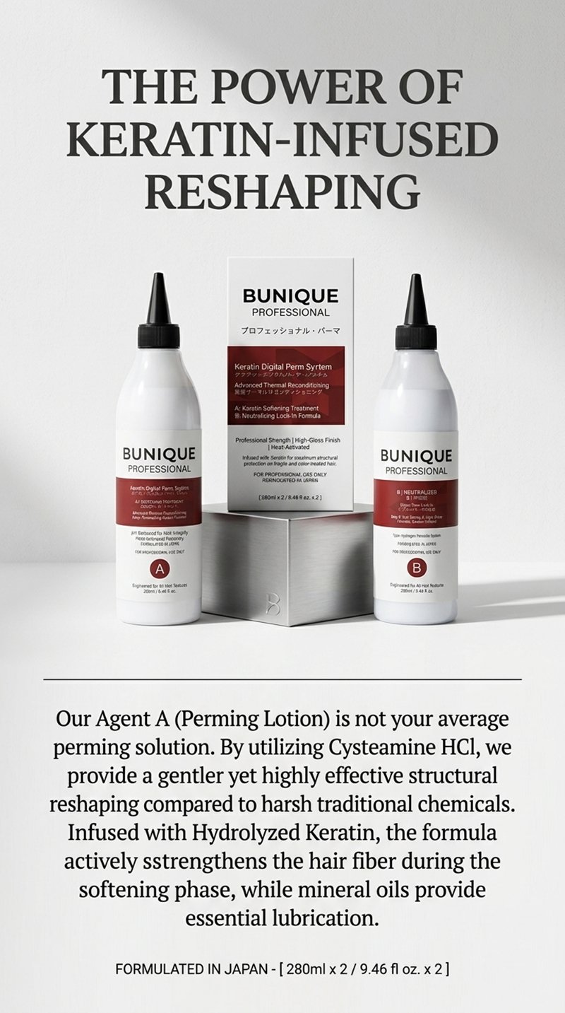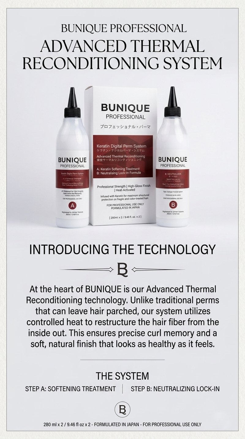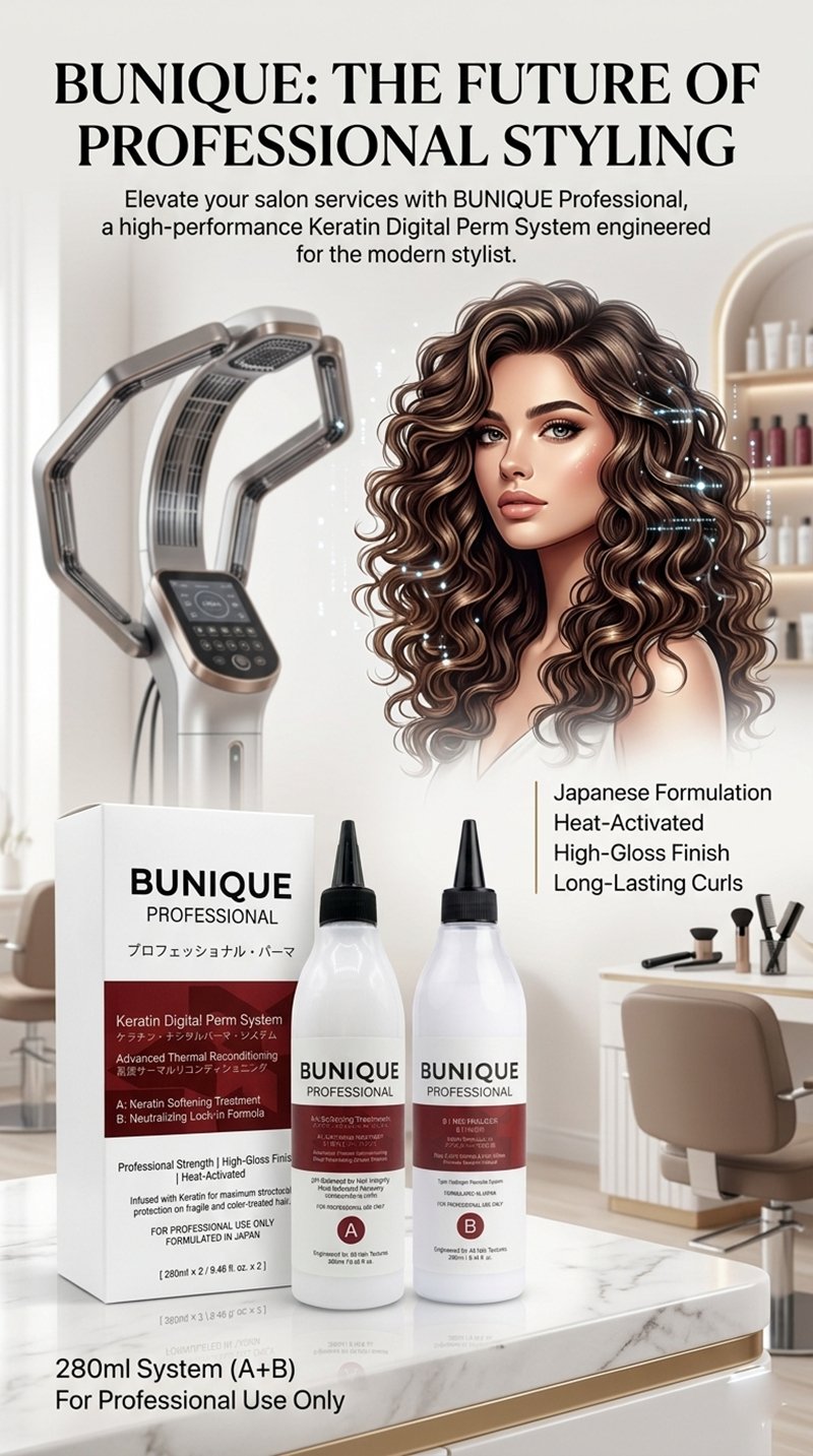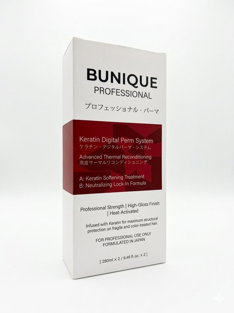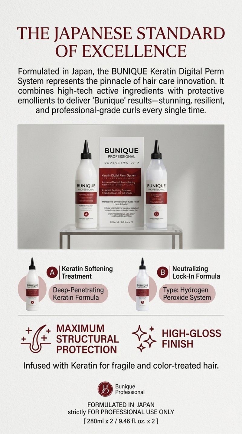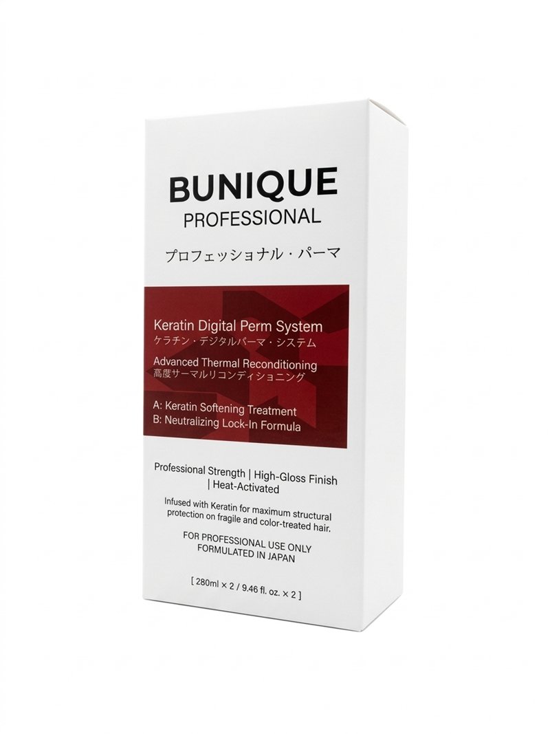 Elevate your salon services with the BUNIQUE Keratin Digital Perm System, an elite, two-step professional solution designed for the modern stylist. Formulated in Japan, this system bridges the gap between high-fashion structural reshaping and intensive hair care, ensuring that every curl is defined, resilient, and radiating a high-gloss finish.