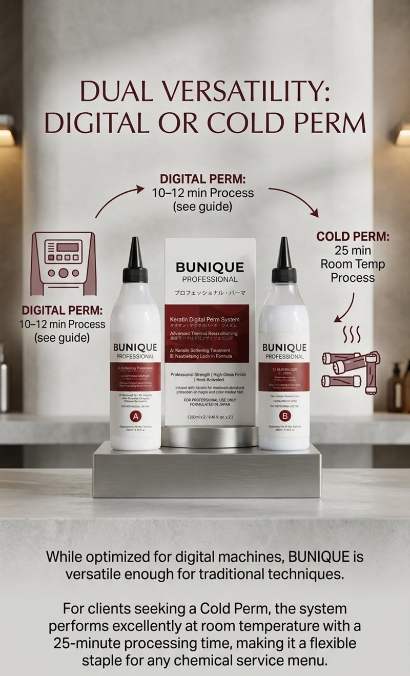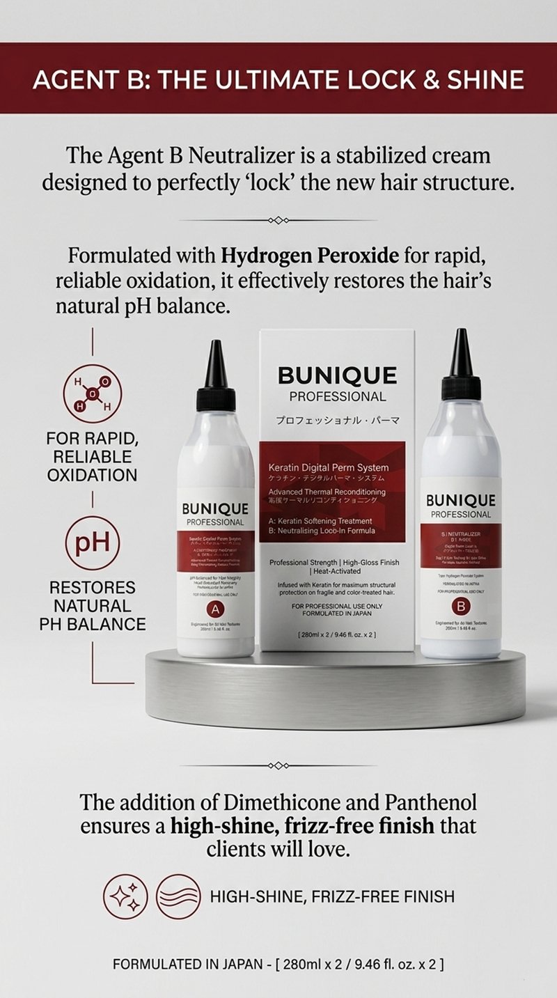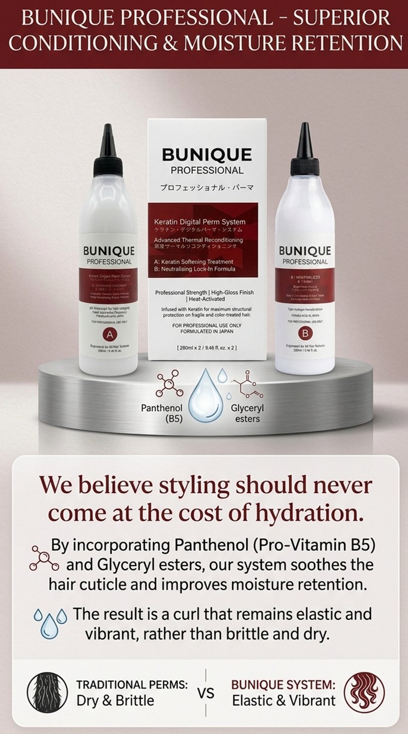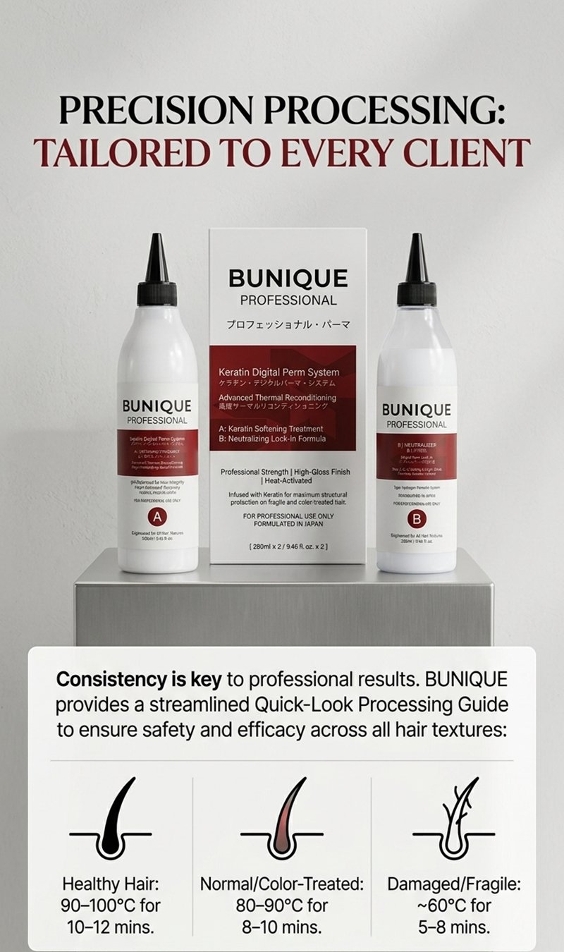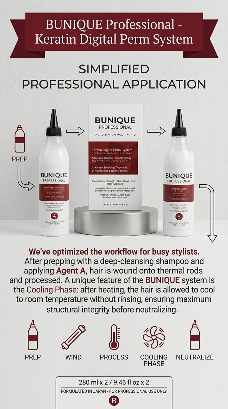 Elevate your salon services with the BUNIQUE Keratin Digital Perm System, an elite, two-step professional solution designed for the modern stylist. Formulated in Japan, this system bridges the gap between high-fashion structural reshaping and intensive hair care, ensuring that every curl is defined, resilient, and radiating a high-gloss finish.