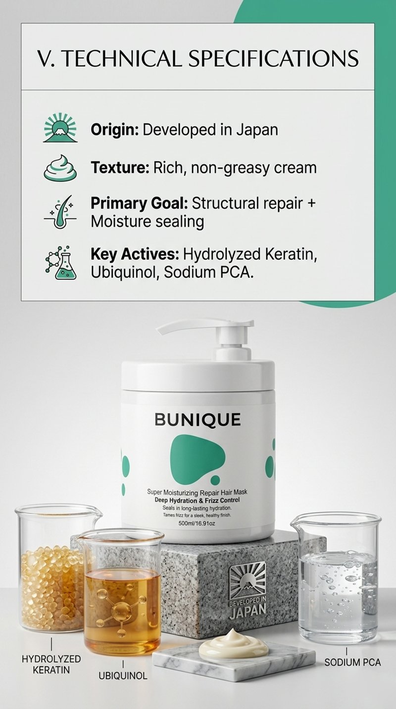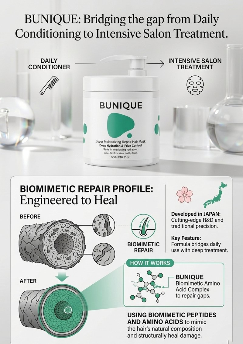 BUNIQUE is engineered to bridge the gap between daily conditioning and intensive salon treatments. Developed in Japan, the formula focuses on Biomimetic Repair—using ingredients that mimic the hair’s natural structure to heal damage rather than just masking it.