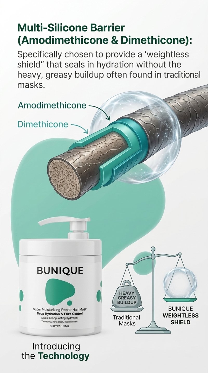 Multi-Silicone Barrier (Amodimethicone & Dimethicone): Specifically chosen to provide a “weightless shield” that seals in hydration without the heavy, greasy buildup often found in traditional masks.