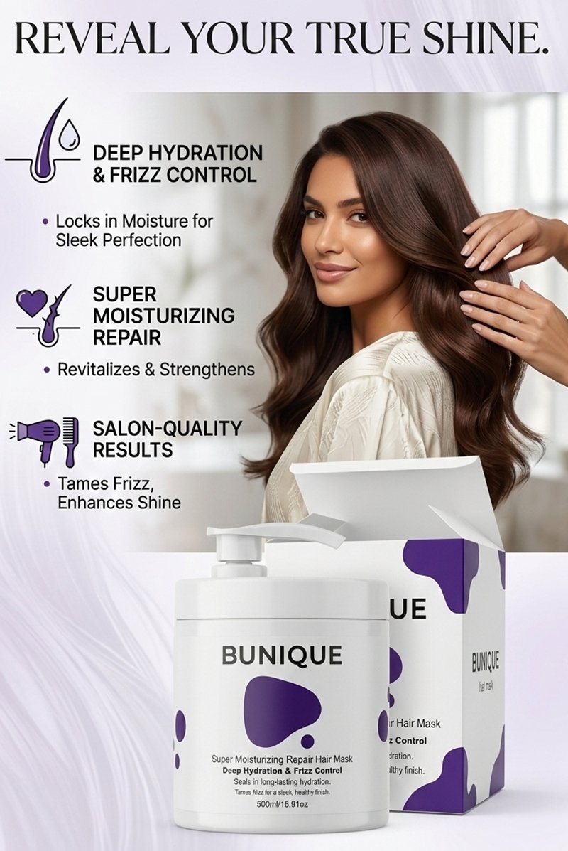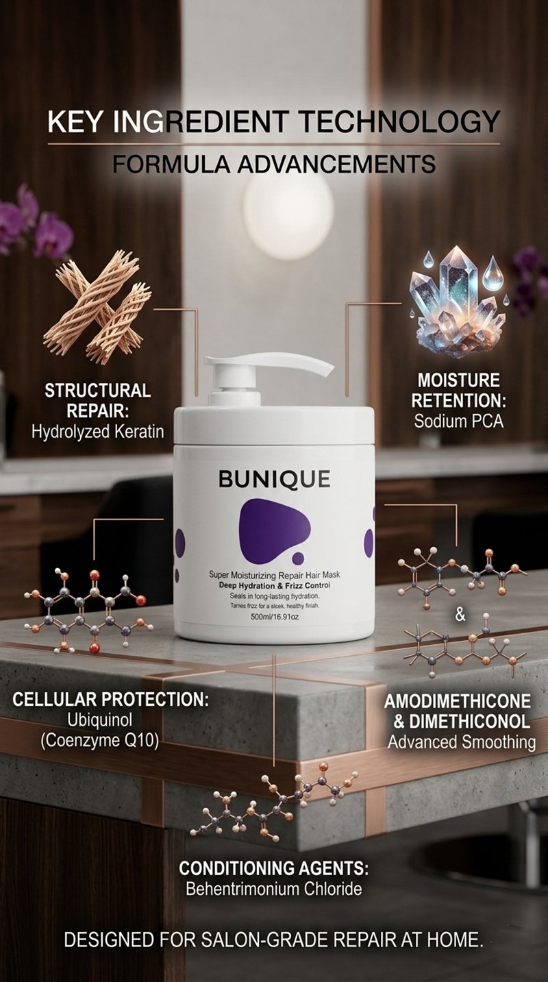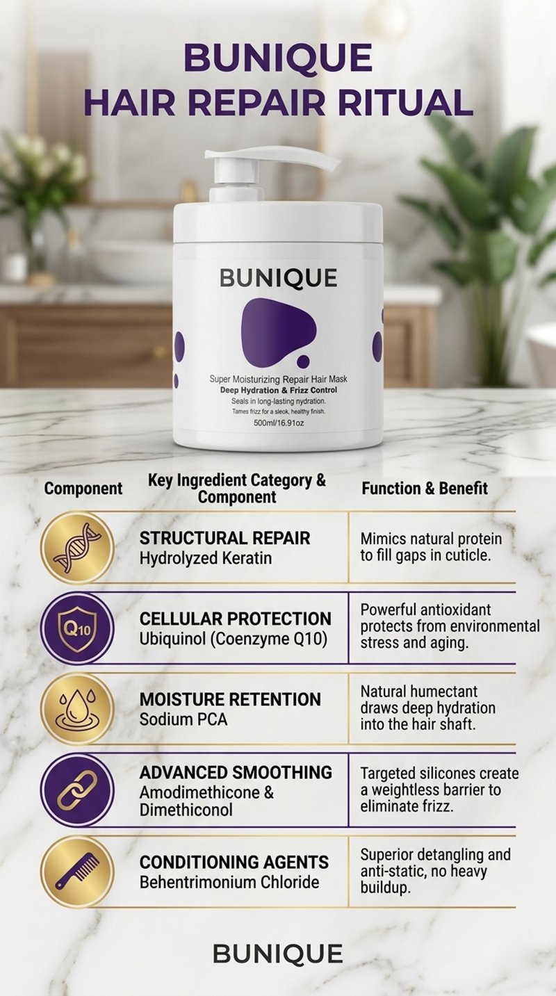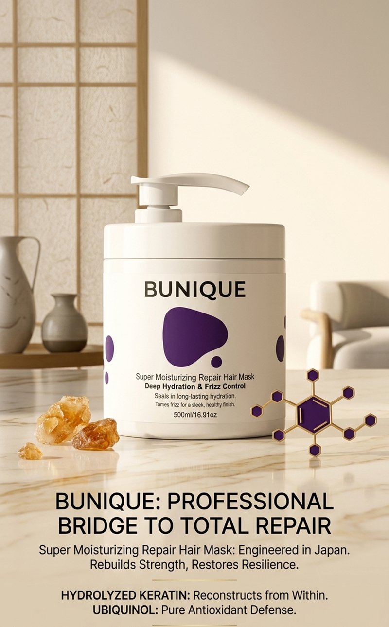 The BUNIQUE Super Moisturizing Repair Hair Mask is a professional-grade treatment engineered to bridge the gap between superficial softening and structural reconstruction. Developed in Japan, it utilizes a dual-action approach: Hydrolyzed Keratin for internal repair and Ubiquinol for external antioxidant defense.