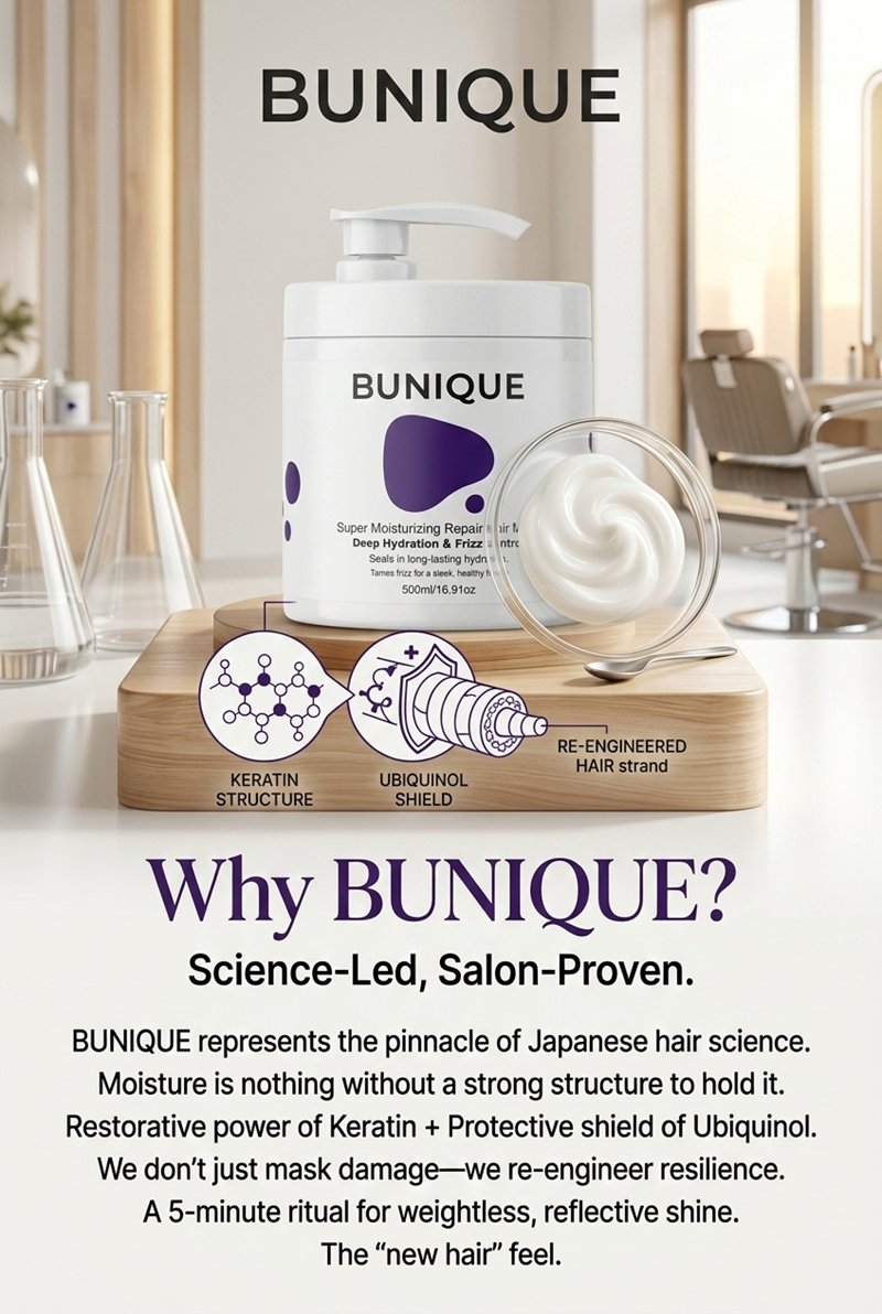 BUNIQUE represents the pinnacle of Japanese hair science. We understand that moisture is nothing without a strong structure to hold it. By combining the restorative power of Keratin with the protective shield of Ubiquinol, we don’t just mask the damage—we re-engineer the hair’s resilience. It is a 5-minute ritual that delivers a weightless, reflective shine and a “new hair” feel.
