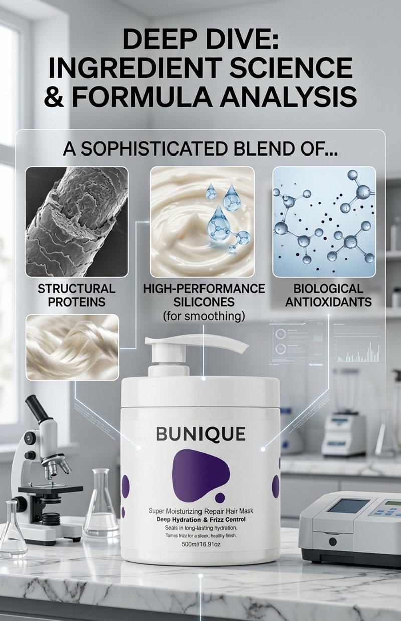 The formulation is a sophisticated blend of structural proteins, high-performance silicones, and biological antioxidants.